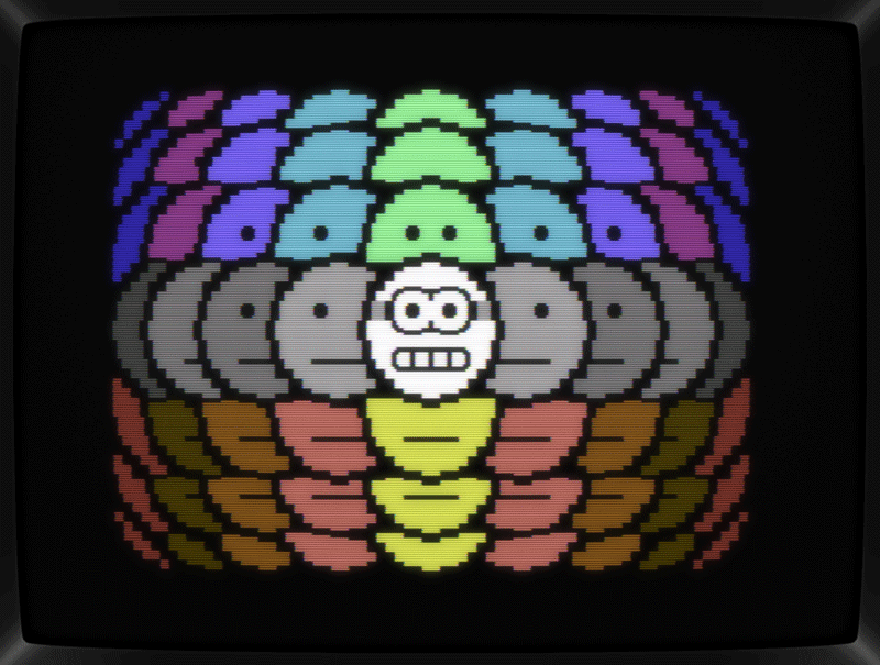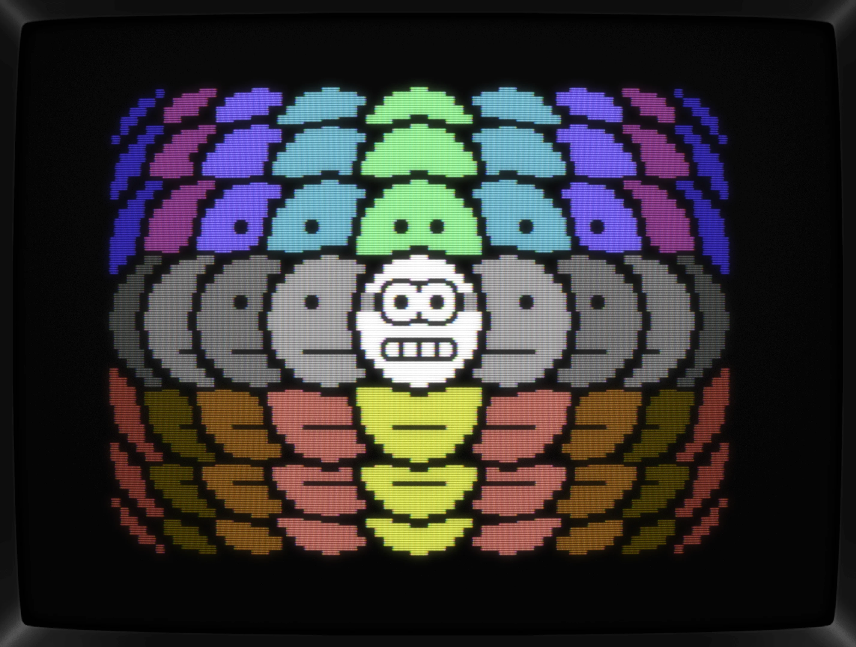 Color cycling is neat, but I also wanted to animate the pic itself. I kept it simple, with only two chars being updated throughout the sequence: the center smiley's eyes!