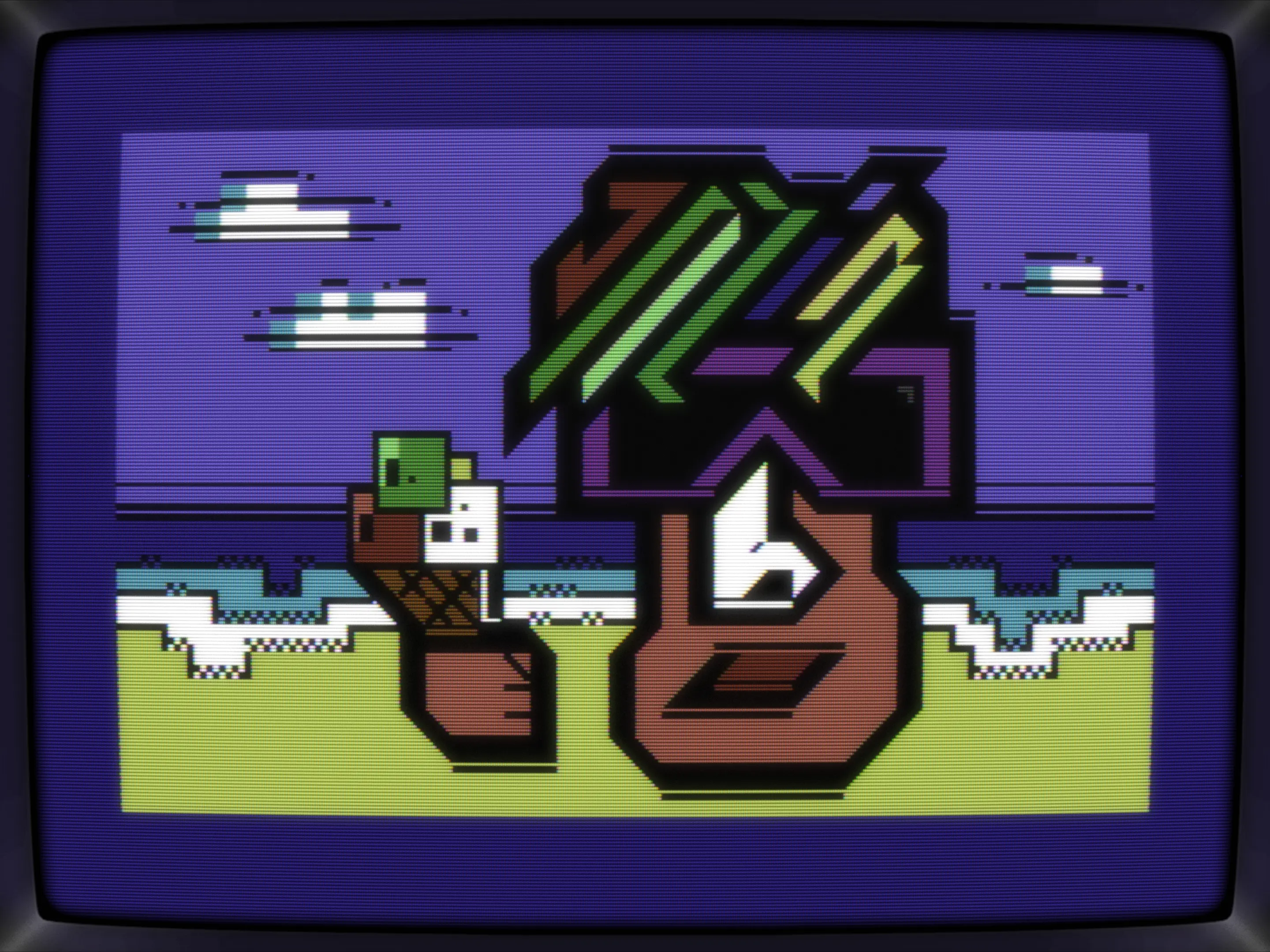 For the background, I've added some fluffy clouds. First, I wanted to do swirly ones, like those in Curse of Monkey Island but have them "squared". Of course, that's something not really doable in small scale PETSCII, so I wen't for just blocks which then turned into blocks and lines and wait a minute, those lines got something, adding details that aren't there, so let's under/overline all horizontal parts.