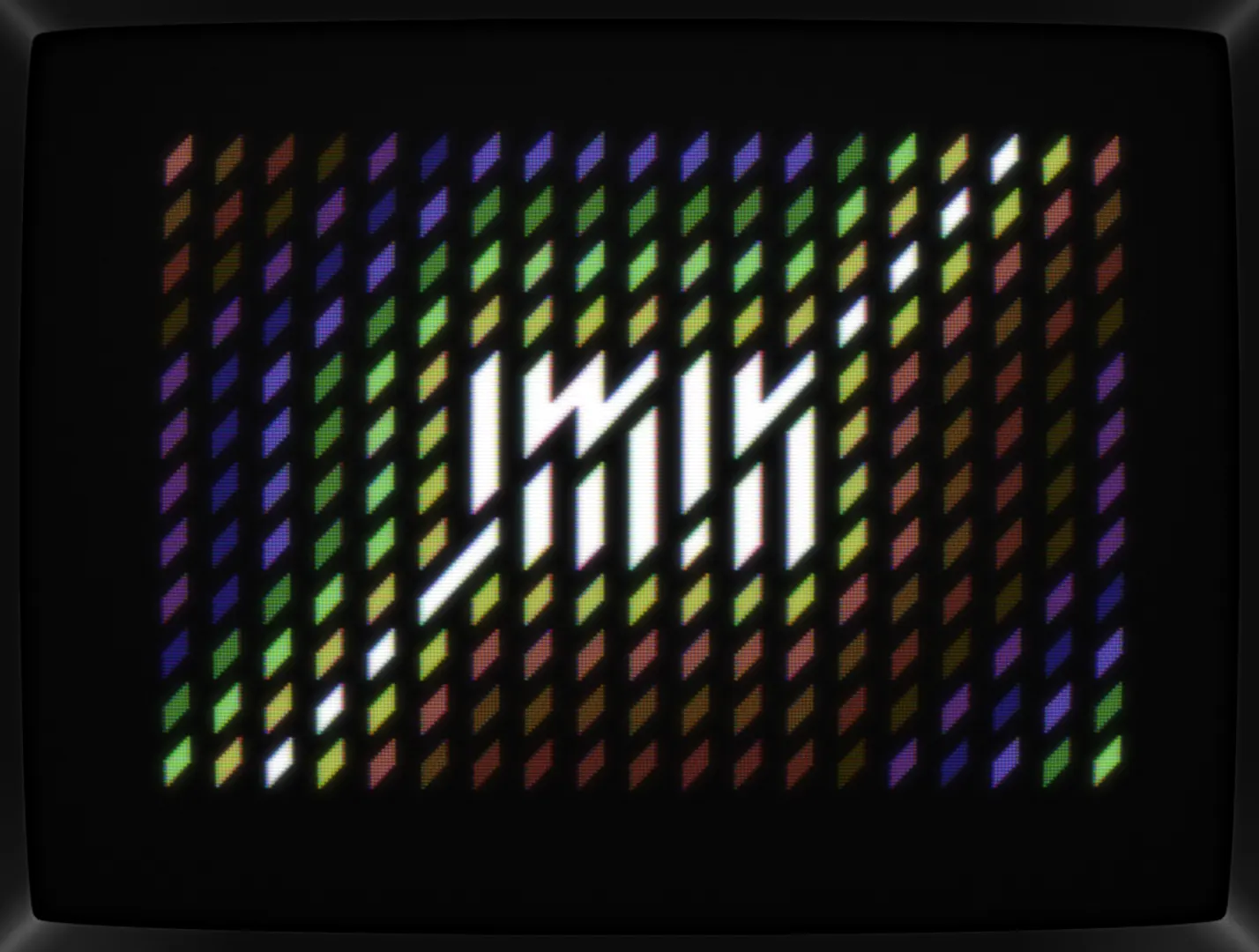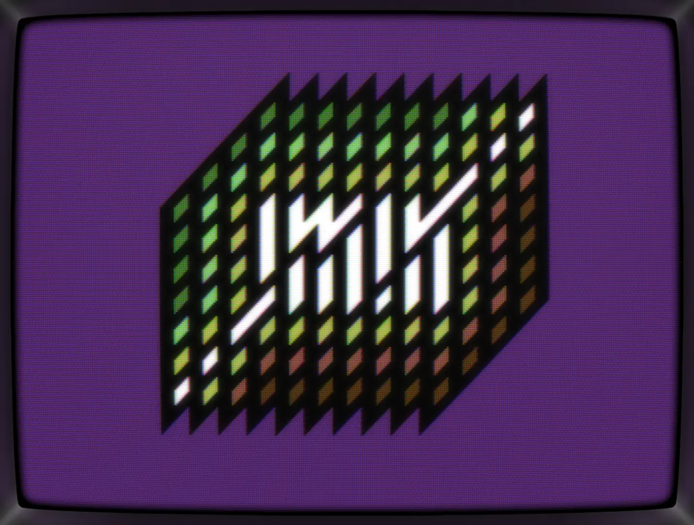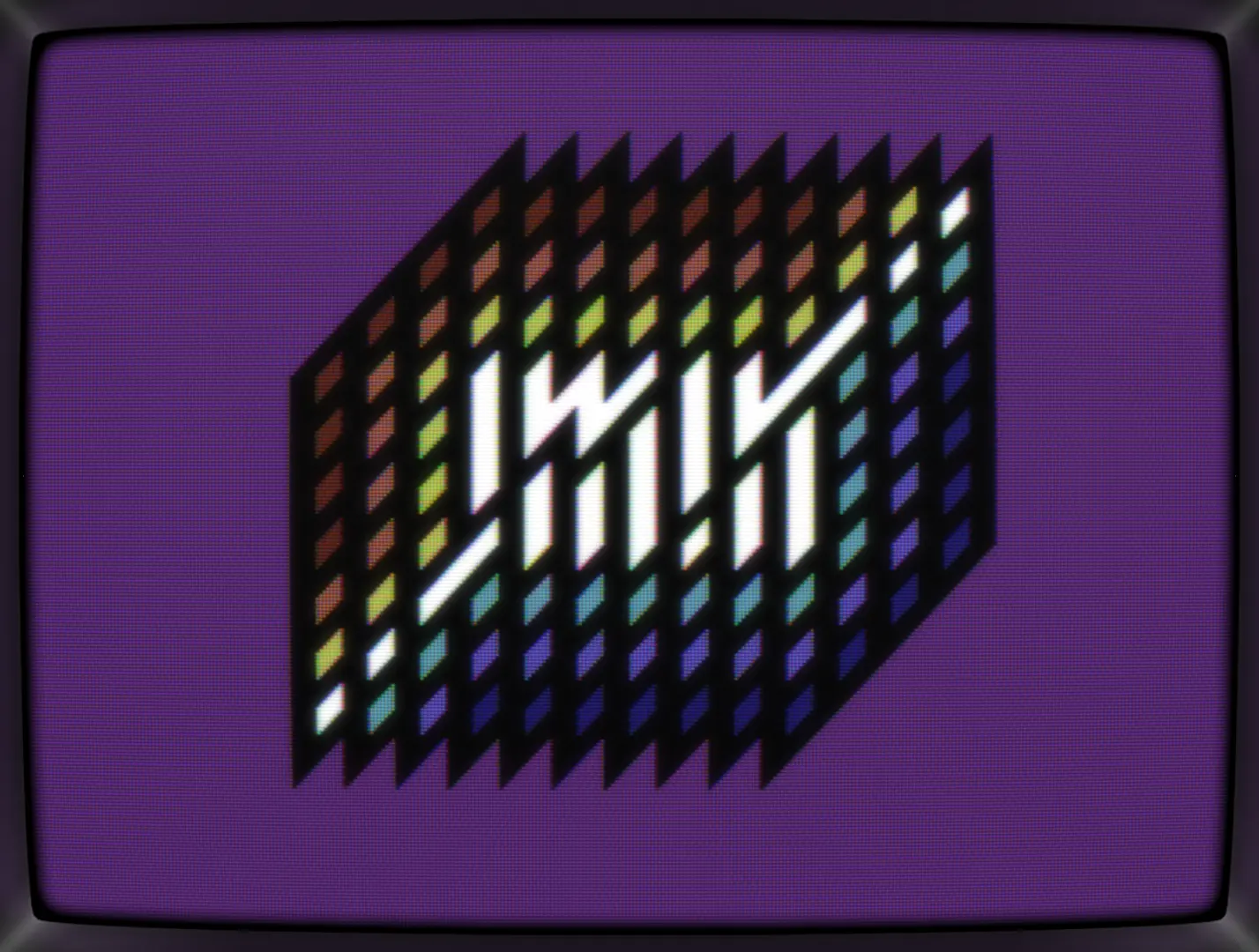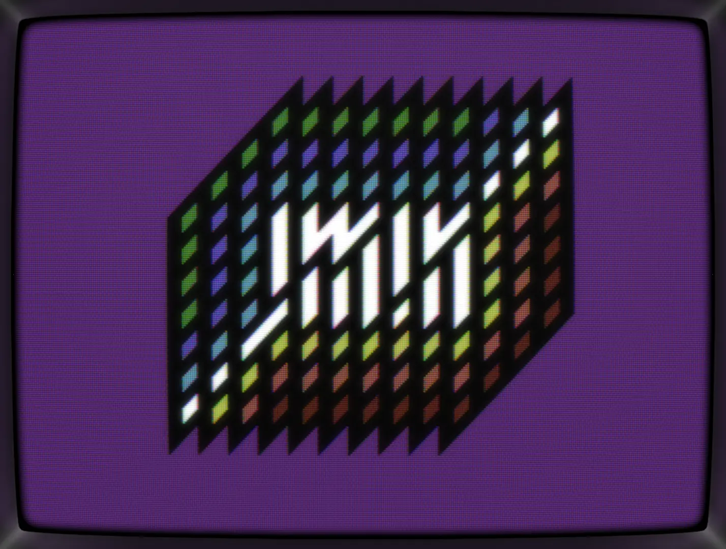Bored by the patterns on my screen, I reduced them down to a single, slanted diamond. Then added some full chars for creating stripes. Cut stripes, huh? Let's add some color. And text. Yep, let's cut that text up. Hmmm...